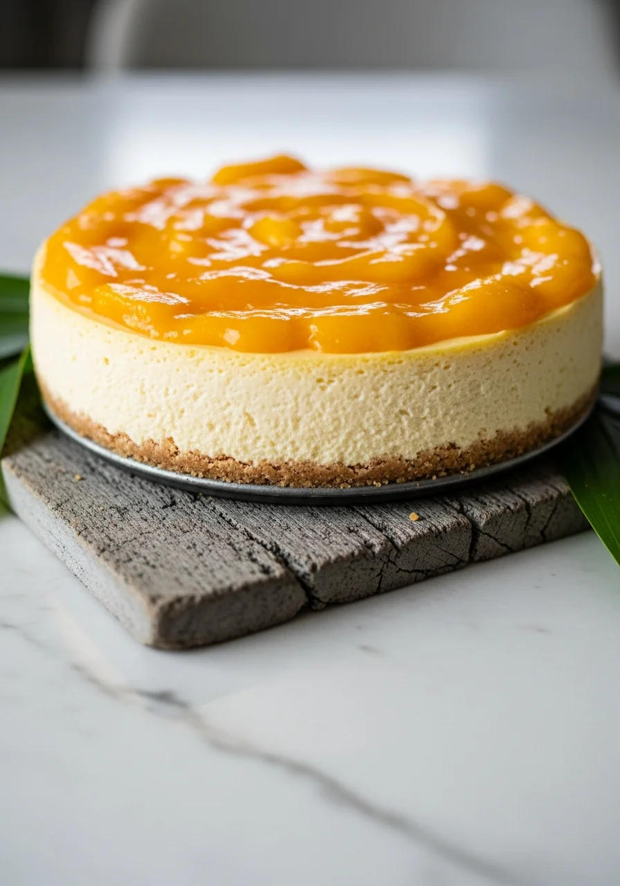 A luscious tropical mango cheesecake with a buttery crust and fresh mango topping that feels like a sun‑kissed breeze on a warm beach afternoon.